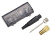 Fits Presta and Schrader valves with no need for adapters. Two 16 gram CO2 cartridges included. New, extra safe feature. Cartridge and pump head can be mounted without opening the cartridge. Also prevents air leakage. Blue regulator enables controlled airflow.